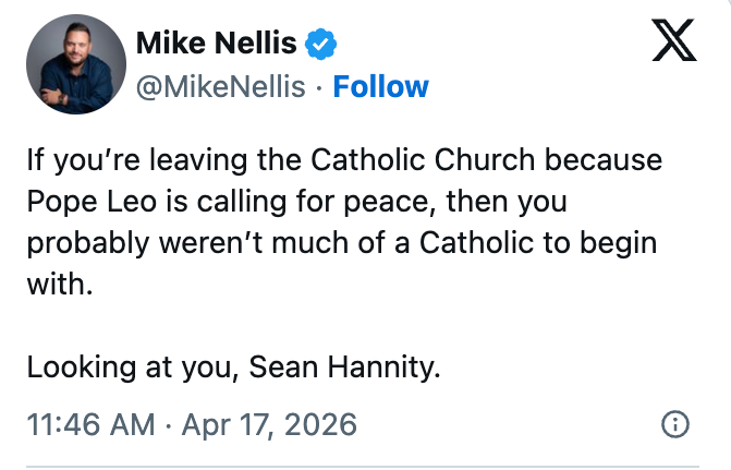 As BuzzFeed's politics lead, my job is to do the doomscrolling for you. Hannity goes on to say "scandals" within the church were left "unchecked," insisting, "Others at the Vatican have totally lost sight of the true meaning of the Bible and its teachings." This is our God: Jesus, King of Peace, who rejects war, whom no one can use to justify war. He does not listen to the prayers of those who wage war, but rejects them, saying: “Even though you make many prayers, I will not listen: your hands are full of blood” (Is 1:15).