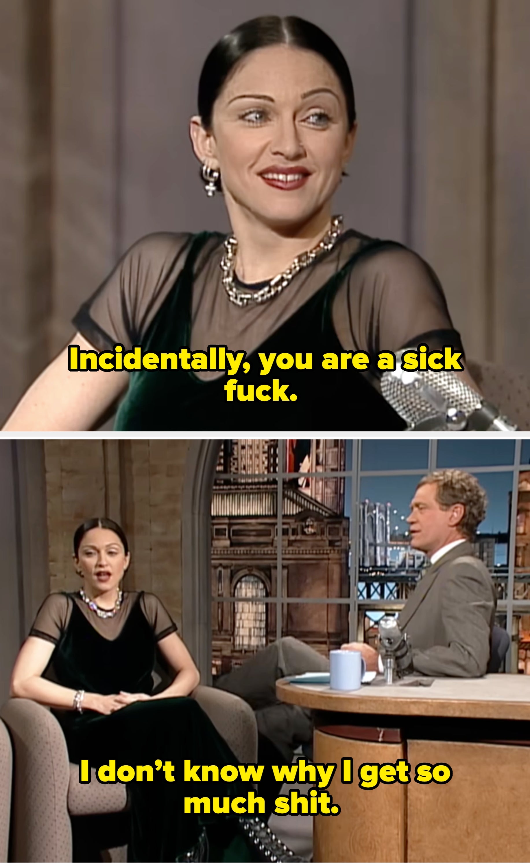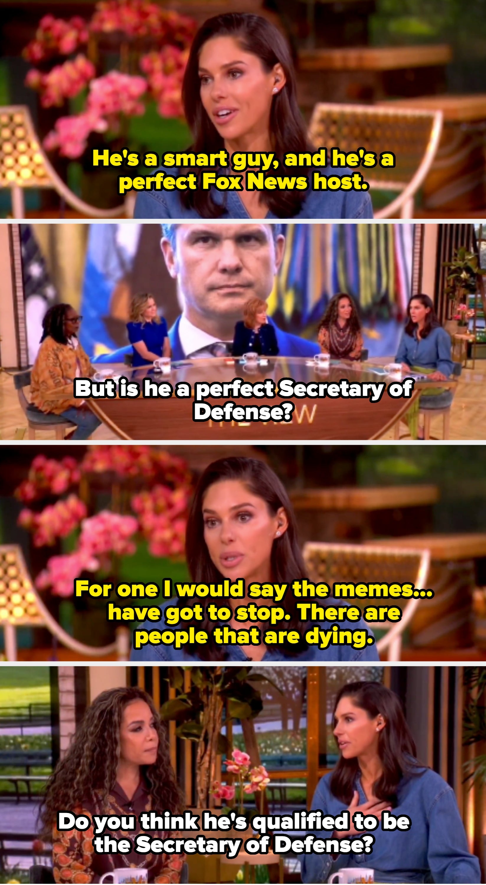 Ellen: How was the party? I wasn’t invited. Dakota: Actually, no, that’s not the truth Ellen. You were invited. Last time I was on the show, last year, you gave me a bunch of shit about not inviting you, but I didn’t know you wanted to be invited. Ellen: Well who doesn’t want to be invited to a party? Dakota: Well I didn’t even know you liked me. Ellen: Of course I like you. You knew I liked you… Dakota: But I did invite you and you didn’t come. Ellen: This time you invited me? Are you sure? Ellen: How do you know? I don’t think so. Dakota: Ask everybody. Ask Jonathan, your producer… Dakota: Aren’t you supposed to let people talk on this show? Jimmy: If I had your email or your phone number I would have called you a gazillion times... Rami: You have my email and phone number. Jimmy: That’s true, but I decided to not call you. Martin: This is the greatest show on television because there is no host in late night that pretends to care the way you do. Martin: I mean, no on captures phoniness the way you do. It’s a gift... Martin, later: I think it's so brave of you, five years in, to decide suddenly to abandon the comedy format. It's shaking her up. Steve: Actually, Marty and I learned from your show. We were backstage watching the monologue and we realized, wow, he must put the laughs in later. Abby: He's a smart guy, and he's a perfect Fox News host. Sunny: Is he a perfect Secretary of Defense? Abby: For one, I would say the memes, the cartoons and the moving memes, have got to stop. It’s really — there are people that are dying. That are losing their lives. Sunny: Do you think he's qualified to be the Secretary of Defense? Abby: I don’t hope for the demise of this country or the people who are in charge right now, so I pray for the best. I am very concerned because the way they are playing this game — Sunny: But do you think he's qualified to be the Secretary of Defense? Abby: — the way they are playing this game right now is like checkers. When the rest of the world is playing chess… Sunny: It sounds like you don't think he's qualified to be the Secretary of Defense. Abby: You know what, I’m very concerned… Sunny: So are you saying that Pete Hegseth is not qualified? Sunny: Pete Hegseth, respectfully who is unqualified for his job. Abby: I'm not here defending – by the way, I don't think Pete is qualified for the job. Savannah: What's so hard for me to witness is people stating that the president is a racist because I’ve seen them firsthand — Savannah: — one of my best friend's lives, a Black woman who has been with him for 18 years. Sunny: So he has a Black friend? He's a racist. Whoopi: Here’s the problem, Savannah, and why we have a different take on it, many of us have a different take on it. Because when you target DEI programs with executive office — with executive orders — your first week in office, arguing that the policies undermine national unity, you know, when you shared racist posts about the Obamas, when you pursued the death penalty for the Exonerated Five — after you knew they had been exonerated — these are the reasons his behavior is so hard and I don’t know whether you know about this, but in the ‘70s he was accused of discriminating against Black tenants because he wouldn’t rent to them. Whoopi: No, that was a proven fact. They took him to court. Kelly: If you kick every Latino out of this country, then who is going to be cleaning your toilet, Donald Trump? Rosie: Oh, that’s not…Latinos are not the only people doing that. Kelly: No, I didn’t mean it like that, come on. I would never mean it like that. Jimmy: The last time you were here, I don’t know if you remember, it was right after you’d opened your big studio in Atlanta. Tyler: Yeah, that you didn’t come to, the big party I had… I remember, I’m still scarred from it. You said you would send me a gift and I still don’t have the gift… Jimmy: I apologize for that, I don’t know what I was doing… oh, COVID, I think COVID was happening. Jimmy: I figured it must have been intended for Jimmy Fallon or something… why would I be invited to your party? Tyler: Well, it said Jimmy Kimmel and I did a special video to you, saying please come, so I don’t know how you could have gotten that mistaken. Tyler: And now you’re remembering why you haven’t invited me back since then. David: How many times have you been in rehab? David: How will this time be different? What are they rehabbing, first of all? What is on their list… Lindsay: We didn’t discuss this in the pre-interview, just saying… David: Is it alcohol? Do you drink too much? Lindsay: We’ve discussed this in the past… Lindsay: We’re here for a movie…let’s stay on the positive. Come on now… Cher, later: I thought that I would never want to do this show with you. David: Now, why? Let’s explore this a little. Why? Because you thought I was a — David: …I knew you probably felt that way. Cher: Because I told the guy on your show. Madonna: Incidentally, you are a sick fuck. I don’t know why I get so much shit. David later, asking a question: ...Is that an untrue rumor? Madonna: Isn’t that an oxymoron, an untrue rumor? Madonna: "Untrue rumor." That’s like "funny David Letterman." Madonna, later: Money’s made you soft… you just kiss up to everybody on your show now. Madonna, later: You do irritate me sometimes… you are always fucking with me on the show. David: ...There's something wrong with her. She can't be stopped. Madonna: There's definitely something wrong with me. I'm sitting here. Katie: Your private parts are different now aren’t they? Carmen: I don’t want to talk about it because it’s really personal. I’d rather talk about my modeling stuff…there’s more to trans people [than their genitals]. She went on: "There’s a young woman named Islan Nettles who on August 17 was just walking down the street with some friends, minding her ow