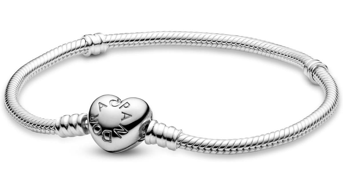 Pandora's heart bracelet adds a simple sterling silver heart clasp to its classic chain. Customize it with Pandora’s many charms, or wear it on its own when you want a more manageable piece of jewelry.