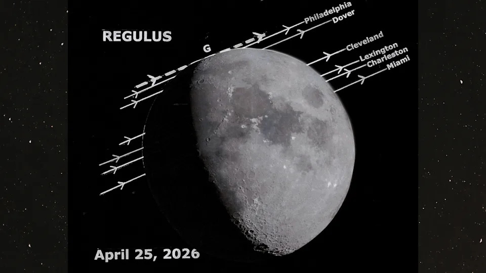 When you buy through links on our articles, Future and its syndication partners may earn a commission. If you live in the middle Atlantic or southeast part of the United States, you'll have an opportunity on Saturday evening, April 25, to see a 70% illuminated waxing gibbous moon gradually drift toward and ultimately hide the 1st-magnitude star, Regulus, the brightest star of the constellation Leo the Lion. This event is called an occultation, a word that is derived from the Latin occultāre, which means literally "to conceal." And if you are fortunate enough to live in the zone of visibility for this event (see below), that's exactly what you will see on Saturday evening: the moon, appearing to temporarily conceal Regulus from your view. Because the moon is waxing, its dark unilluminated portion faces forward as it advances eastward against the starry background. Regulus will thus disappear on the moon's dark limb. That event should easily be visible with binoculars and if your background sky is dark enough and if you have sharp vision, you may even be able to watch the occultation with the naked eye (though you might need to block the glare of the moon's bright portion behind a nearby wall or tree limb). Regulus will suddenly and dramatically "pop" off, as if a switch were thrown, a stunning demonstration of the moon's orbital motion and the star's tiny angular size. The star will reappear from behind the moon's sunlit edge sometime later. To see the reappearance, you'll most definitely need a telescope, since the star will be buried in the glare of the moon's brilliant limb — a tiny blue-white diamond suddenly and dramatically erupting into view on the lunar horizon. If you live anywhere to the south of a line that curves roughly from near De Tour Village, Michigan, across Lake Huron to Mississauga, Ontario, then on southeast across a portion of western New York, northeast Pennsylvania and continuing through western and central New Jersey, you'll see the moon passing in front of Regulus. If you live north of this line, you'll see the moon slowly glide below Regulus, resulting in a tantalizing near miss! From New York City, Regulus will appear closest to the moon's dark upper limb at 9:04 p.m. EDT, missing it by just a scant 30 arc seconds or a mere 1/63 of a lunar diameter! From Boston, the closest approach comes at the same time as New York, but the gap between the two will be somewhat wider, equivalent to 2.9 arc minutes or about 0.05 degrees. Still exceptionally close. And if your town or city happens to lie fortuitously within about two or three miles on either side of the line, you may have an unusual opportunity to see the grazing occultation of a 1st-magnitude star. As Regulus appears to move tangent to the moon, it might just disappear and reappear a few times along the rugged terrain of the moon's dark limb, just off to the left of its upper cusp. The best place to witness this is New Jersey, where twilight will be rapidly fading and the background sky will be quite dark. Another important consideration is whether the occultation occurs against a dark sky, a twilight sky, or a daytime sky. The optimal locations for viewing this event will be central and southern New Jersey, as well as near and along the Pennsylvania/New Jersey border. Also, right along and near the immediate shoreline of the Delmarva Peninsula, down to about Ocean City, Maryland. Lastly, the Outer Banks of North Carolina. From all these locations, Regulus will disappear behind the moon's dark limb against a cobalt-blue sky during nautical or late twilight, with the sun at least 12 degrees below the horizon. Going about 100 miles to the west places you under mid-twilight conditions; the background sky is a bit brighter, but you still should be able to see Regulus using binoculars. Going farther west, however, brightens the sky even more and anywhere west of a line from approximately central Michigan, going south through east-central Kentucky to the Gulf Coast will be bathed in full daylight. If you are using a telescope, you should still be able to get a glimpse of Regulus against the blue daytime sky, so long as your sky is clear and free of any haze and the sun is low to the horizon. Of course, it also helps when you know in advance that the star is situated right next to the moon. For all the above-mentioned locations, the reappearance of Regulus will occur either in a completely dark sky or during deep (late) twilight. We have provided a graphic showing Regulus's track behind the moon on the evening of April 25, as viewed from selected locations in the eastern United States. The table below provides the times of Regulus's disappearance and reappearance at 15 selected locations. All are in the Eastern time zone. Those times listed with an asterisk (*) indicate that the disappearance occurs either during bright evening twilight or at sunset. All other times occur during the period from mid-twilight through the end of evening twilight. Location Disappearance (ET) Reappearance (ET) Lexington, KY 8:18 p.m.* 9:24 p.m. Atlanta, GA 8:18 p.m.* 9:35 p.m. Detroit, MI 8:28 p.m.* 9:10 p.m. Charleston, WV 8:29 p.m.* 9:42 p.m. Cleveland, OH 8:30 p.m.* 9:14 p.m. Cape Canaveral, FL 8:30 p.m. 9:52 p.m. Miami, FL 8:33 p.m. 9:59 p.m. Norfolk, VA 8:41 p.m. 9:03 p.m. Niagara Falls, NY 8:42 p.m.* 9:02 p.m. Salisbury, MD 8:46 p.m. 9:24 p.m. Dover, DE 8:48 p.m. 9:20 p.m. Williamsport, PA 8:49 p.m. 9:09 p.m. Philadelphia, PA 8:52 p.m. 9:15 p.m. Atlantic City, NJ 8:54 p.m. 9:16 p.m. Allentown, PA 8:55 p.m. 9:09 p.m. A detailed set of predictions for 660 selected locations is available on the website of the International Occultation Timing Association (IOTA). Times are given in Universal Time (UT) and included is a color-coded map depicting the region of visibility. Joe Rao serves as an instructor and guest lecturer at New York's Hayden Planetarium. He writes about astronomy for Natural History magazine, Sky and Telescope, The Old 