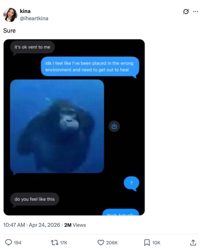 “starting to run in your 30’s is a great way to meet new people. today i met two paramedics, one nurse and almost God.” I'm Chelsea, the Weekend Editor at BuzzFeed, where I cover everything from pop culture and politics to TV and celebrity news. Editor's Note: While we can't endorse what X has become, we can bring you the worthwhile moments that still exist there, curated and free of the surrounding chaos. Also, make sure to follow these users if you like their tweets! Me outside of my moms room at 9pm to tell her I need a poster board for tomorrow: pic.twitter.com/U02PBrMzMD me with the laundry from the dryer https://t.co/US0lPMjhBA *i’m not picky*me after seeing the menu pic.twitter.com/PHejo99rWi me ready to crash out because i can still feel the oil on the plastic container after the 5th wash: pic.twitter.com/PyPlPJbxNF