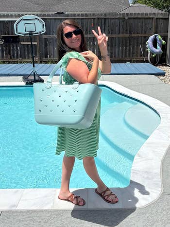 Promising review: "The best sports mom bag I’ve found! Not only is it cute, but it’s also completely functional. I love that it holds so much (the large is perfect for lots of stuff, but not overly huge. I can pack water bottles, snacks, sunscreen, books/Kindle, umbrella, and everything in between! I also love that I can personalize it with charms and stuff — the Bogg bag charms fit. Also, the fold-down straps are great. They don’t get in the way at all. I’ll also note that it’s super easy to clean. Just empty it and spray it out with a hose. Even the white has stayed clean. Love love love! Get this bag! You won’t regret it!" —Amoora