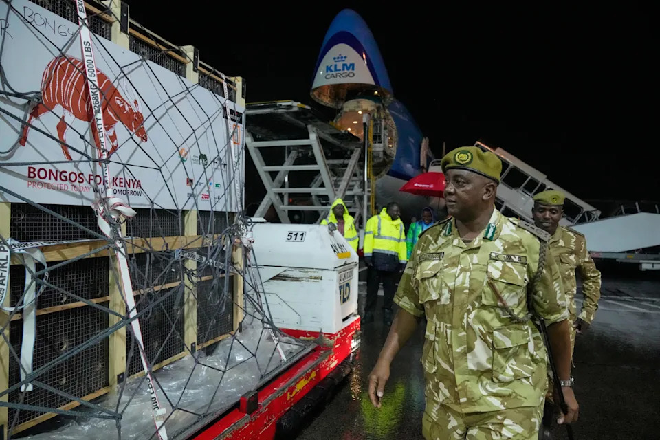 NAIROBI, Kenya (AP) — Four critically endangered mountain bongos arrived in Kenya on their way to their native forests after years in the care of a zoo in the Czech Republic. Bongos, rare antelopes known for their striking stripes, have been declared critically endangered due to poaching and diseases. There are less than 100 mountain bongos left in the wild, according to the Kenyan government. Many were sent to Europe in the 1980s after a major rinderpest disease outbreak killed thousands. The four returnees arrived from Dvur Kralove Zoo packed in wooden crates at Kenya’s main airport aboard a KLM cargo flight and were received by the country’s Prime Cabinet Secretary Musalia Mudavadi and Tourism Minister Rebecca Miano, who hailed it as a “homecoming of the majestic bongos.” It's the third such return in recent years, last one being in Feb. 2025. After a period of quarantine and acclimatization, the bongos will be sent to the Mount Kenya Wildlife Conservancy, which houses 102 bongos, for a stay before being released into the wild. The conservancy runs a National Recovery and Action Plan for the Mountain Bongo in collaboration with the government and plans to use the four new bongos to interbreed and strengthen the gene pool. Kenyan-raised nature explorers and filmmakers Jahawi and Elke Bertolli told The Associated Press that the new bongos will bring genetic variation that is critical for their conservation, adding that the species plays a key role in protecting the forests that are vital to Kenya’s water supply. Czech Republic Ambassador Nicol Adamcova said the relocation reflects a long-standing partnership between the Czech Republic and Kenya in conservation and a shared commitment to protecting endangered species. Mudavadi said such milestones show what can be achieved when policy, science, and collaboration come together in pursuit of a shared conservation goal. “I commend all stakeholders involved and assure you of Government’s unwavering support in strengthening conservation frameworks and ensuring that Kenya’s biodiversity continues to thrive,” he said. Miano said that bringing in genetically diverse bongos is a critical step to strengthen the species' breeding resilience.