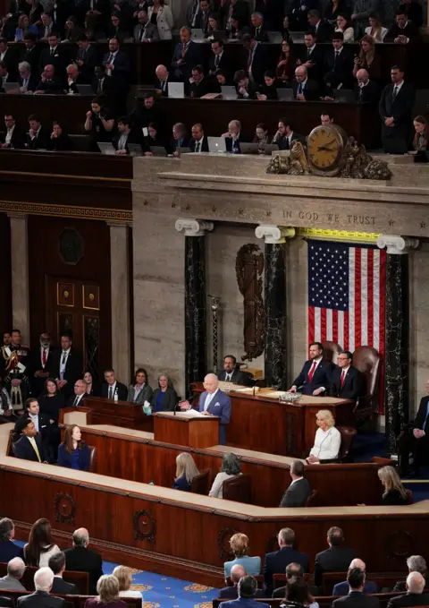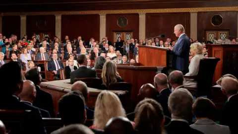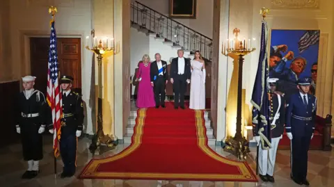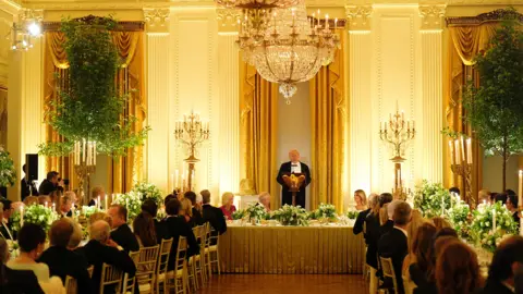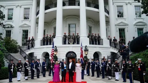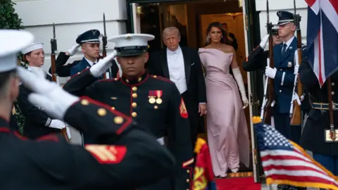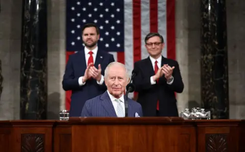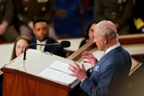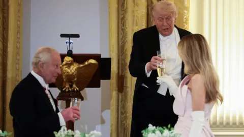 King Charles III and Queen Camilla continued their four-day state visit to the US on Tuesday with a lavish state banquet, an aircraft flyover at the White House, and a speech from the King to Congress. The trip, which comes as the US approaches the 250th anniversary of its independence from Britain, is aimed at celebrating the strong relationship between the two countries. During his address to the state dinner, Trump described the history and bond between the US and UK "a friendship unlike any other on Earth", as well as praising golfer Rory McIlory, who was in attendance. Before entering the White House, the president praised the King's speech to Congress, saying he had made him "very jealous". The King responded with his own speech, making jokes about White House renovations and Winston Churchill. Earlier, the King had arrived in the House of Representatives chamber to applause from hundreds of onlookers, including top US officials. He followed in the footsteps of his late mother, Queen Elizabeth II, who had addressed the chamber in 1991. In his speech, the King said the destinies of the US and UK had been interlinked ever since America's independence. "As Oscar Wilde said, 'We have really everything in common with America nowadays except, of course, language!'" the King joked to laughter from his audience. King Charles promoted the importance of protecting the environment. "As we look toward the next 250 years, we must also reflect on our shared responsibility to safeguard Nature, our most precious and irreplaceable asset," he said. The statement received a standing ovation. The King concluded with a message of unity: "I pray with all my heart that our alliance will continue to defend our shared values, with our partners in Europe and the Commonwealth, and across the world, and that we ignore the clarion calls to become ever more inward-looking." Earlier in the day, King Charles and President Trump held a closed-door meeting inside the Oval Office of the White House. Senior British and American officials were also present during the meeting. On Tuesday morning, the royals received a ceremonial welcome at the White House, where President Trump presented a military spectacle to the King and Queen, including gun salutes and bugles. President Trump gave a speech in front of the White House, in which he joked it was a beautiful British day - an apparent reference to the rainy conditions, which drew laughter. Trump said the King's speech to Congress later was "going to make everyone very envious of that beautiful accent". "He's a very elegant man," Trump said, before describing "the noble spirit of the British" and discussing the UK and US's shared history. Following Trump's remarks, the King, Queen, president and first lady walked up the steps to the balcony overlooking the White House South Lawn to observe a flyover and troops marching below. The previous day, the Royals arrived in the US by plane at Joint Base Andrews, Maryland, to a waiting red carpet. After walking through a guard of honour, a military band played both the US and UK national anthems. The royal couple then went on to meet Donald and Melania Trump at the White House for afternoon tea. The King and Queen attended a British embassy garden party, where the King chatted with former speaker of the House of Representatives Nancy Pelosi among other guests. He tells US lawmakers his address comes the two nations' relationship is "more important" than ever "in times of great uncertainty". There were some lines in the speech that may have buoyed Democrats โ and raised eyebrows in the White House. The US president was speaking about his mother Mary's love for the Royal Family during a speech at the White House, attended by the King and Queen. King Charles will address the US Congress on Tuesday at a time of diplomatic tensions between London and Washington. After landing, the royals were greeted by US President Donald Trump at the White House and later visited the British Embassy.